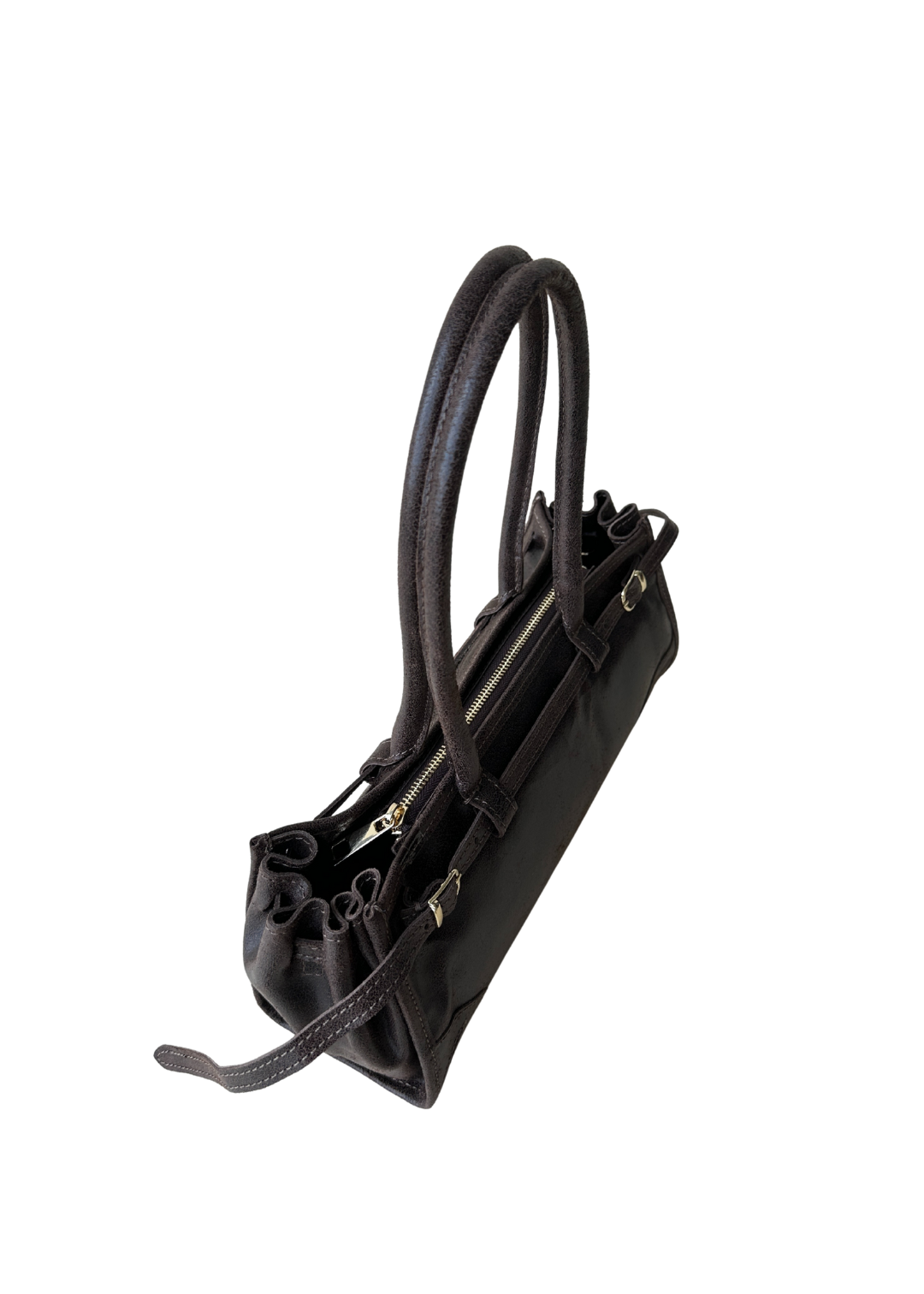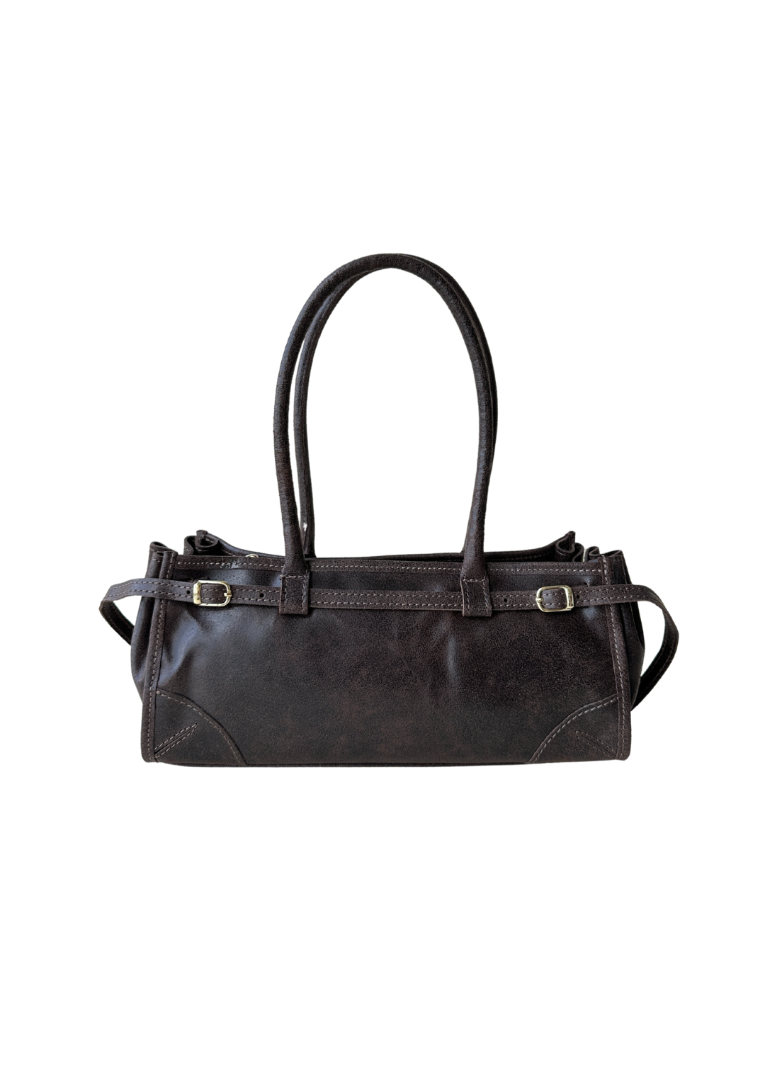 Bolsa de piel con asas largas, detalle de hebillas, y un toque deslavado vintage. Súper amplia y resistente, ideal para el diario. Con strap incluido.