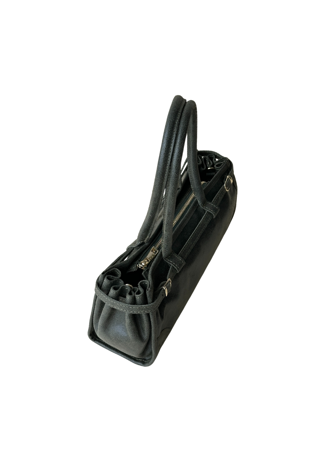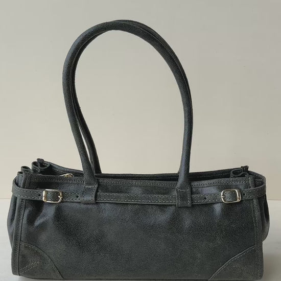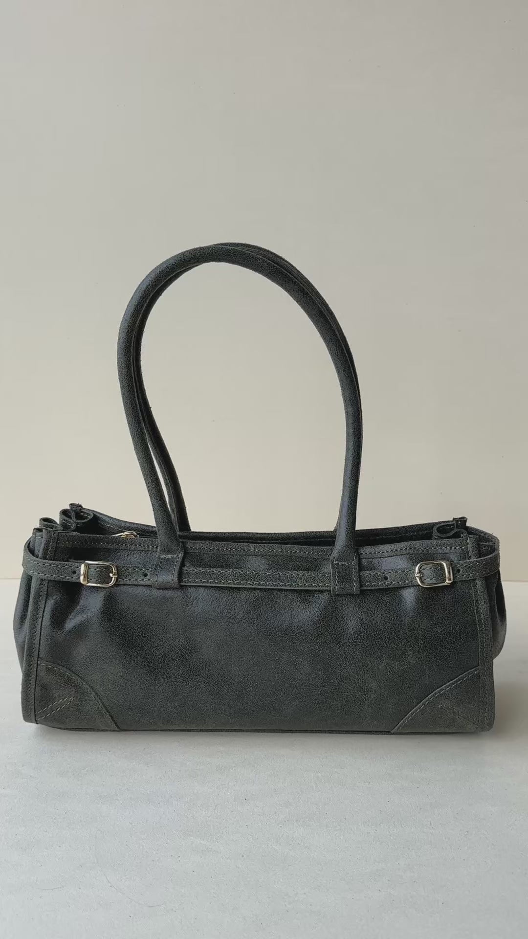 Bolsa de piel con asas largas, detalle de hebillas, y un toque deslavado vintage. Súper amplia y resistente, ideal para el diario. Con strap incluido.