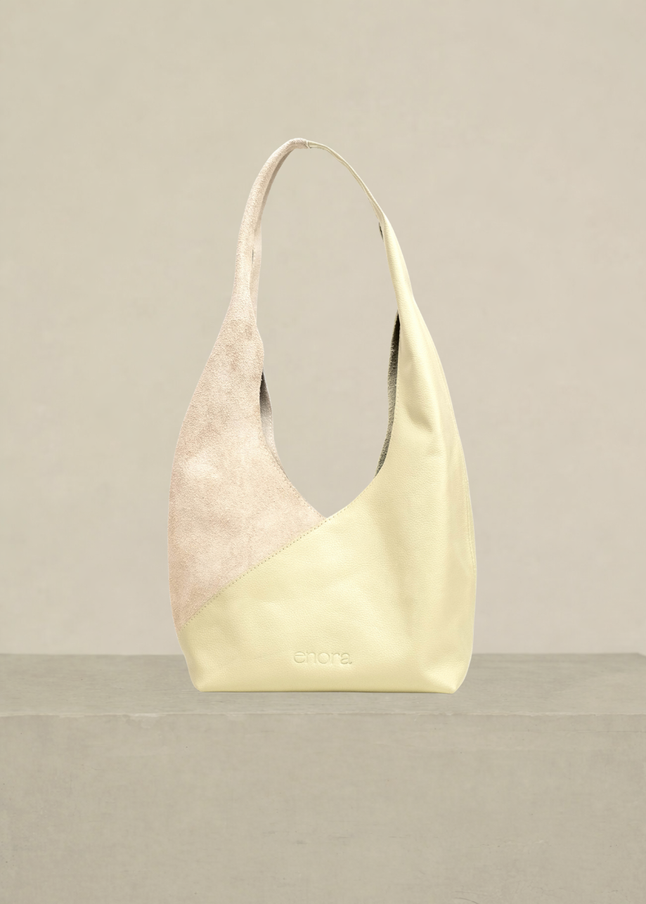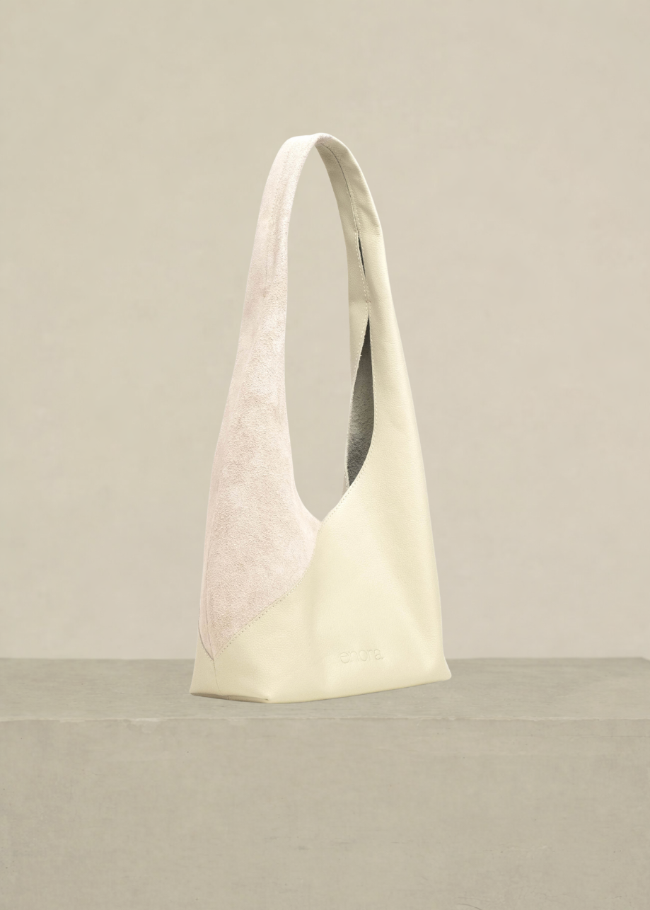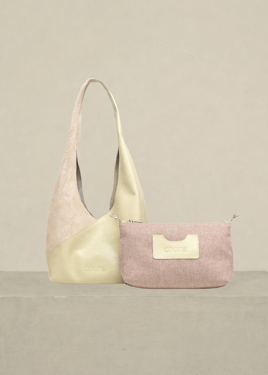 Bolsa de piel y gamuza con asa amplia al hombro. Diseño suave y ligero, súper cómoda para el día a día. Incluye pouch desmontable con cierre metálico para mayor practicidad.